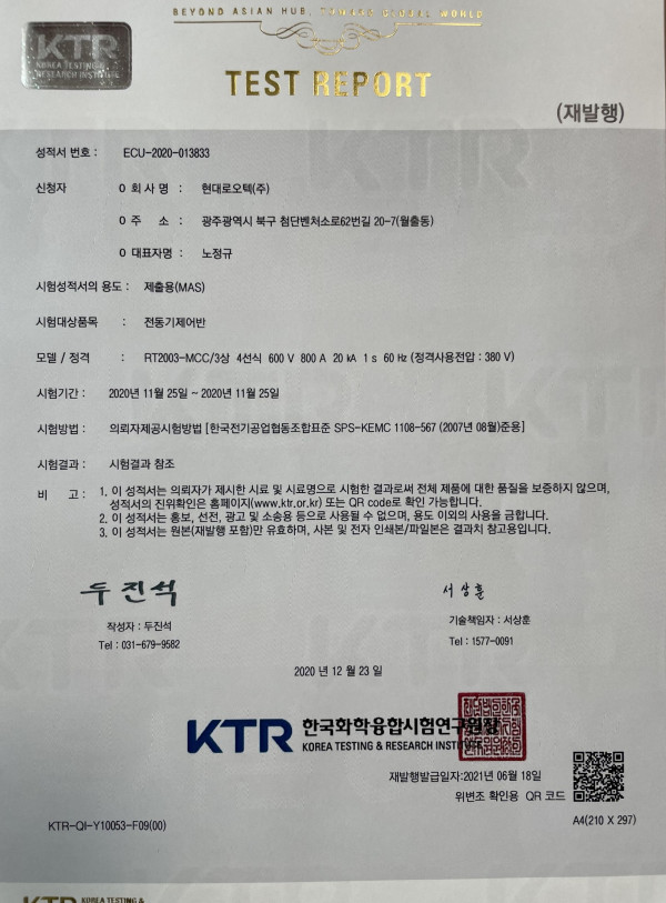 형식승인 전동기제어반 시험결과지