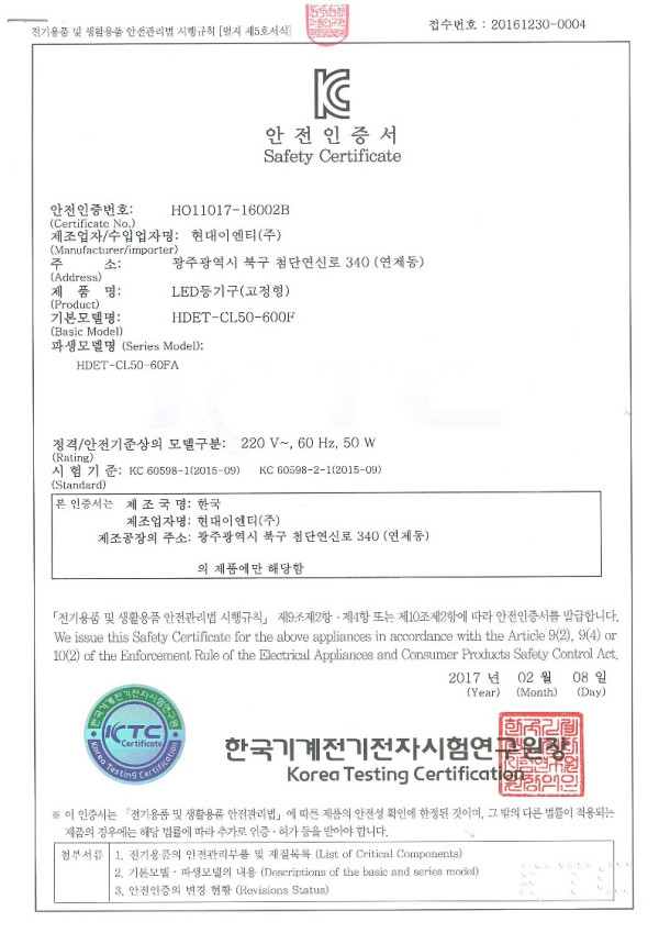 KC인증 고정형 50W 무궁화 방등 파생 > 인증서