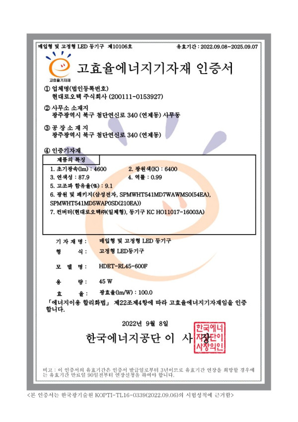 인증서 고효율에너지기자재인증서 (고정형 LED등기구 45W)